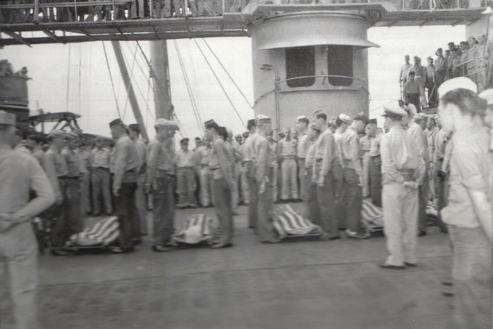 The blow which struck your son killed him instantly. As soon as he was hit two men carried him out of the damaged compartment. Our doctors examined him at once but he was beyond any assistance they could give. We carried his body down to the sick bay, encased it in a canvas burial shroud and then placed it in a wooden coffin. We buried him that afternoon. His flag draped coffin was placed on the quarterdeck and in the presence of Admiral R.A. Spruance, Commander of the Fifth Fleet, his staff, and the entire ship's company, I read the prayers over him. Six men from his division acted as bearers. They were Jimmy Wakefield S2c of Tulsa Okla., Fred Harrison of Waterbury, Conn., Jimmy French S1c of San Francisco, Cal., Vincent Allard QM3c of Omak, Wash., Robert Owens QM3c of Kingsport, Tenn., William Burt of Boise, Idaho. They carried him into a small boat alongside. The Marine firing squad fired three volleys and the ship's bugler sounded taps. We buried him in the American Cemetery on one of the small islands of the Pacific. The flag which draped his coffin is being sent to you and you should receive it soon.