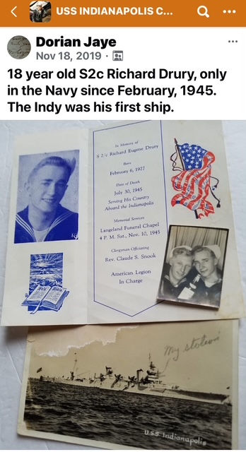 Robert returned home after the war. A second telegram reported that Richard Eugene Drury, serving aboard USS Indianapolis CA-35 which sunk July 30, 1945, had no chance of survival. Navy records reported his body unrecoverable.