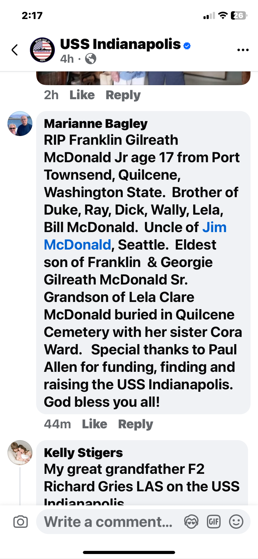 | Franklin served in his local Washington State Guard, Company C., 4th Washington Volunteer Infantry, from April 18, 1944, to October 9, 1944. This records notes he was a “student” and it can only be assumed he was a senior in high school. “In January 1941 the Washington National Guard was mobilized into federal service and the Washington State Guard reestablished to assume responsibility for state military missions. Not long after, however, it was determined by state officials that the increased probability of U.S. entry into WWII carried with it a heightened threat of invasion and the new force would need to be reorganized to defend the state's territory rather than simply fulfill civil assistance missions. Recruiting was suspended and the entirety of the force was organized into the State Guard Reserve, which was simply a roster of individual personnel. In June, soldiers of the State Guard Reserve began to be reconstituted into a formed force with the activation of the Fourth Washington Volunteer Infantry Regiment. As of December the regiment was fully trained and equipped and, by early 1942, the size of the State Guard had increased to just over 4,000 soldiers and officers with the force reorganized into two brigades. The State Guard, during this time, was primarily composed of older men, however, in 1944 the state began actively recruiting younger males with the idea that it could provide a potential source of post-war manpower for the returned National Guard.” [Wikipedia - Washington State Guard] Franklin was Honorably Discharged from the WA State Guard on October 9, 1944, with a notation that he was “Entering US Naval forces.” His exact date of enlistment in the US Navy is unknown. He was received at the US Naval Training Center, Farragut, Idaho as a AS (Apprentice Seaman), from the Navy Receiving Station, Seattle, WA on September 6, 1944. This leaves little doubt that Franklin enlisted in the Navy in early September, 1944. There is no explanation for why his name remained on the roll of the WA State Guard until October 9, 1944, after he had enlisted in the US Navy. Perhaps it was a clerical error. While in training in Farragut, Idaho, his rate was advanced to S2c (Seaman 2nd class) on December 8, 1944. Shortly after, he was transferred. On December 15, 1944, Franklin arrived at the Naval receiving station at Shoemaker, CA. Six days later, December 24, 1944, he was transferred to the receiving station at San Diego. On December 26, 1944, Franklin again was transferred to the Naval Air Station in Alameda, CA. From there he was transferred to the receiving station at Camp Elliott, San Diego, CA. All of the above transfers were in route to join his assigned ship. Four days later, December 30, 1944, Franklin was received aboard USS Indianapolis CA-35 as a F2c. The muster roll of Indy for July 1, 1945, shows his rate continued as F2c. This is the last muster roll available. After only 7 months on board, Franklin was lost at sea when Indianapolis was torpedoed and sunk on 30 July, 1945. His name is inscribed on the Tablets of The Missing in the American Manila Cemetery, Fort Bonifacio, Taguig, Philippines. Burial at Sea Franklin was one of the twenty-eight crew members picked up and identified by USS Helm between Sunday August 5, 1945 to Monday August 6, 1945. It not being possible to bring Franklin aboard for the official Burial at Sea Ceremony he was reverently placed in a sea bag, weighted with two 5" shells and "committed to the deep" by his fellow seamen. Sources: (1) Facebook post by Marianne Bagley on Memorial Day, 2025 (2) 1940 US Census, WA, King Co., Seattle, HH #5815 on First Ave., NW. Enumerated April 6, 1940. Citing Frank G. McDonald, Sr. and family Official USN records and deck logs and muster rolls | |
