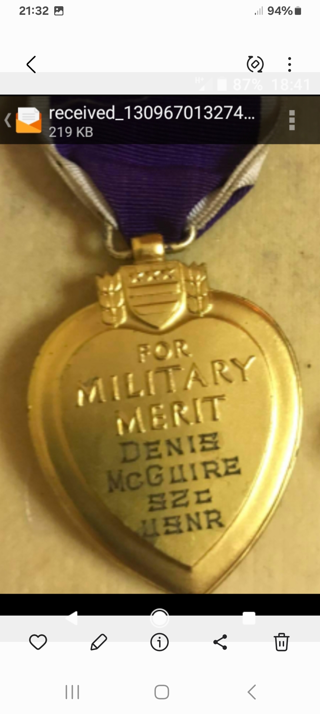 Please view the additional photos section below to see photographs of the Front and Back of LAS Denis McGuire’s actual Purple Heart Medal which was awarded posthumously.