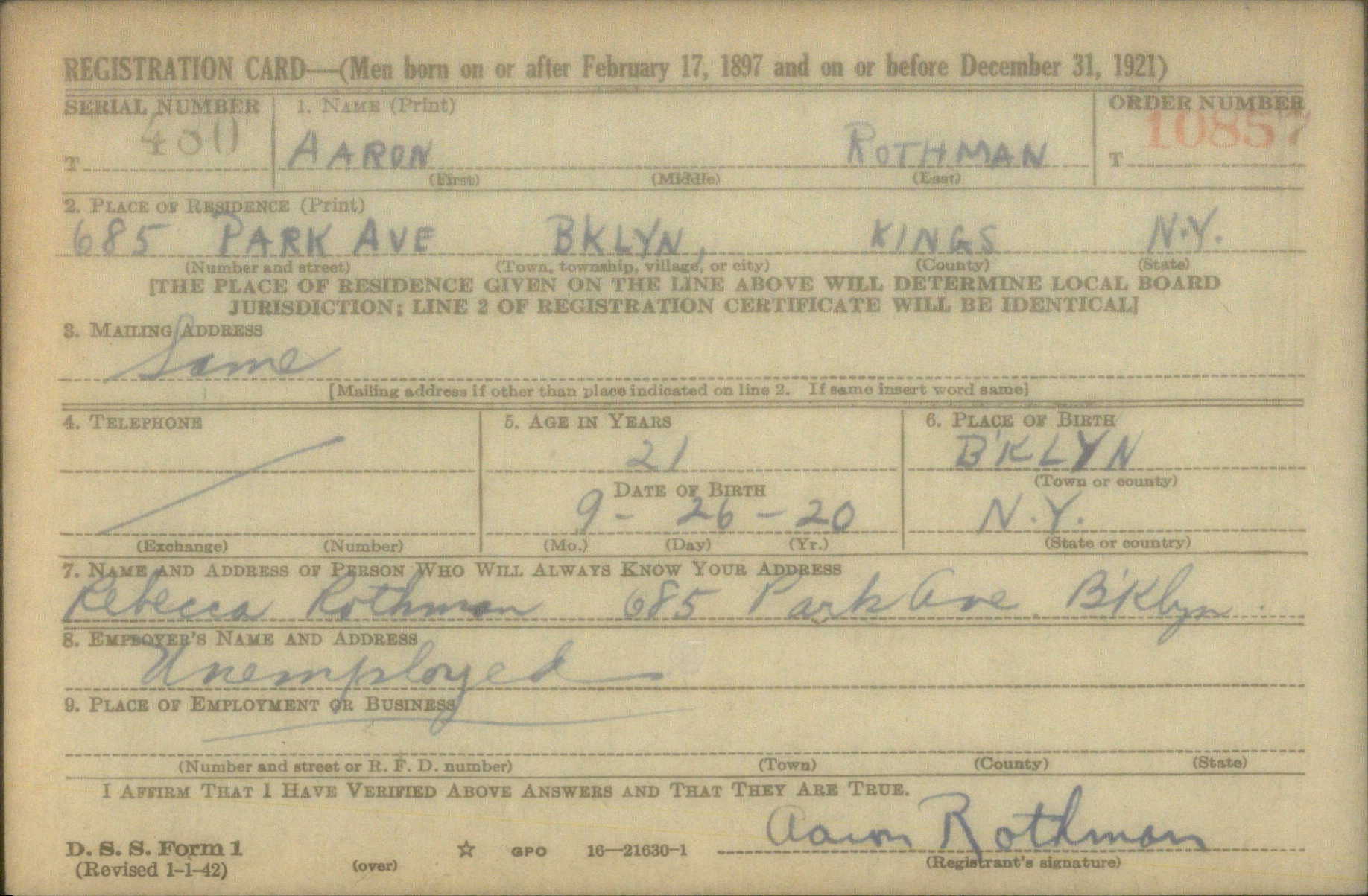 Navy Department, Casualty Section, Office of Public Information (1946): Combat Connected Naval Casualties, WWII, by States; Vol. MT-WY; NY, p. 61; citing Aaron Rothman, Radarman 3c, USNR, son of Mr. and Mrs. Hyman Abraham Rothman, 514 Willougby Ave., Brooklyn.
