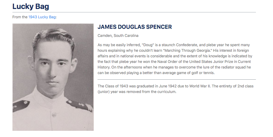 | Lieutenant James Douglas Spencer was born in Washington, D.C. on August 30, 1919. He graduated from the United States Naval Academy in 1943. Spencer’s bio in “LUCKY BAG” (1943 United States Naval Academy Yearbook) presented the following key information about him: “As may be easily inferred, “Doug” is a staunch Confederate and plebe year he spent many hours explaining why he couldn’t learn “Marching Through Georgia.”. His interest in foreign affairs and in national events is considerable and the extent of his knowledge is indicated by the fact that plebe year he won the Naval Order of the United States Junior Prize in Current History.”.” (1) View the “Additional Photos” section below to access and read Spencer’s full entry in the “LUCKY BAG” yearbook. "Doug was appointed to attend the United States Naval Academy from Indiana and entered the academy on 6 June 1939. After graduation, he attended various schools and then reported to the cruiser USS RENO in December 1942 in connection with fitting out and commissioning. The RENO participated in the Philippine Campaign while Doug was aboard. In November he was ordered to flight school at Ottunwa, Iowa which he left in May 1945 for duty aboard the cruiser USS INDIANAPOLIS. The INDIANAPOLIS steaming singly at night was sunk by a well aimed torpedo spread on 29 July 1945 fired by the Japanese submarine I-58. This was the last major U.S. ship sunk by the Japanese and with it was lost our last classmate to die in World War II, Doug Spencer. He wore the Purple Heart, American Defense Service Medal with Fleet Clasp, Asiatic-Pacific Area Campaign Medal with two bronze stars, and the Philippine Liberation Ribbon. He was survived by his parents, Rear Admiral and Mrs. Douglas Ancorum Spencer, USN (Ret) who at Doug's death resided at 4000 Massachusetts Avenue, N.W., Washington, D. C."(2) As a United States Naval Academy graduate who served aboard Indianapolis on that fateful last voyage, Doug joined eight other naval academy graduates who also lost their lives as a result of the July 30, 1945 sinking of the ship. The full list of Annapolis graduates who were Lost at Sea on USS Indianapolis includes: Robert Burton Billings, Ensign Edwin Mason Crouch, Captain Joseph Ambrose Flynn, Commander Robert Huntley Hurst, Lieutenant Johns Hopkins Janney, Commander Stanley Walter Lipski, Commander Harold Clifton Moynelo, Jr., Ensign Michael R. Pessolano, Lieutenant James Douglas Spencer, Lieutenant View the “Additional Photos” section below to see pictures and brief information on each of these nine officers. (3) (1) - LUCKY BAG Yearbook, United States Naval Academy, 1943. (2) - Class of 1943 anniversary book “25 years later .....” (3) - United States Naval Academy Virtual Memorial Hall, www.usnamemorialhall.org. | |