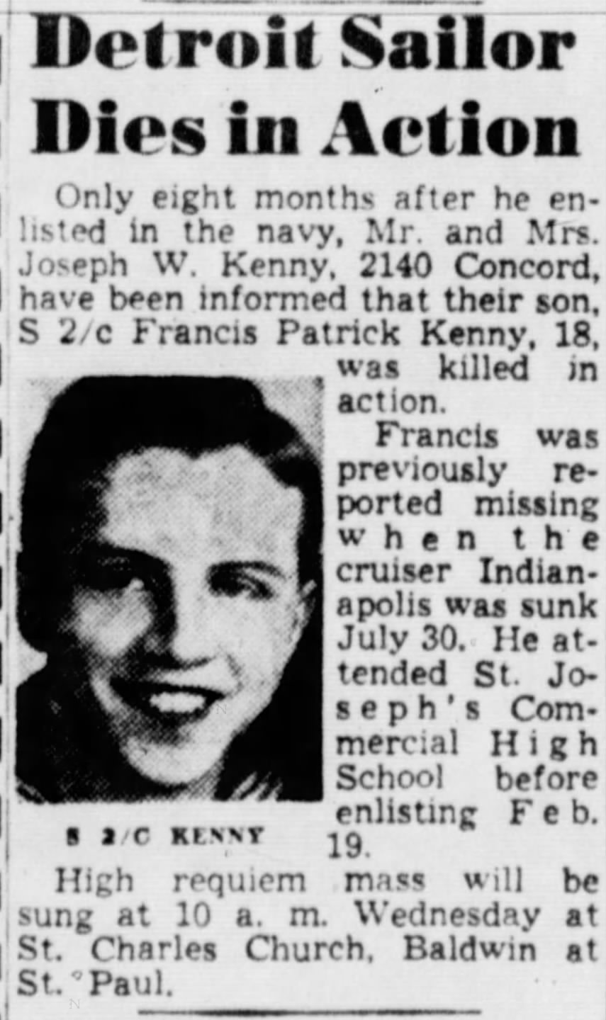 Francis J. P Kenny was born March 17, 1927 and boarded Indianapolis May 12, 1945 at the age of 18.