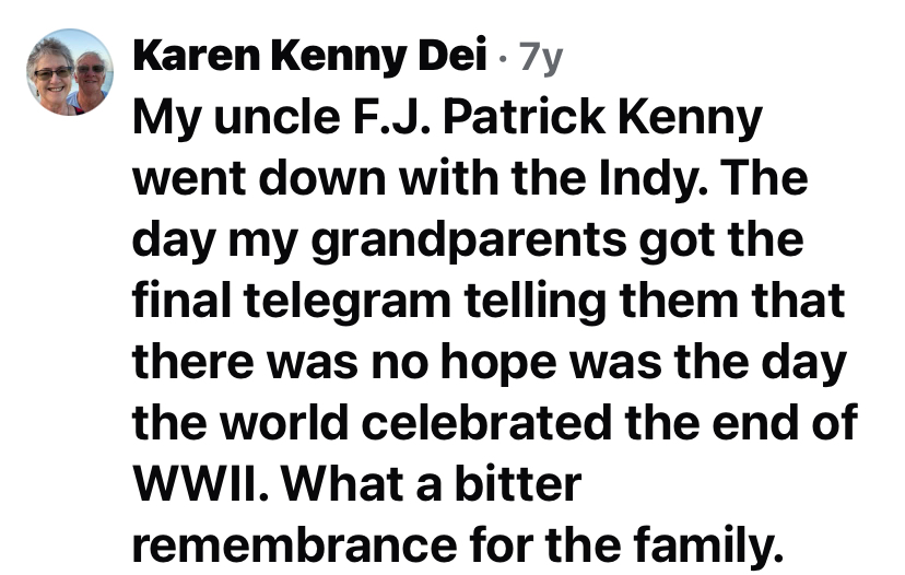 When information went out about the Indy sinking, two of Pat's brothers (one on a transport in the Army, the other in the Coast Guard) heard the news and tried to find out Pat's fate. They knew about his loss before the family had been notified.