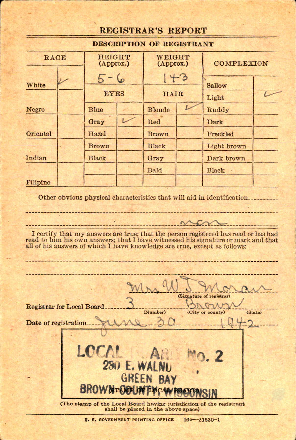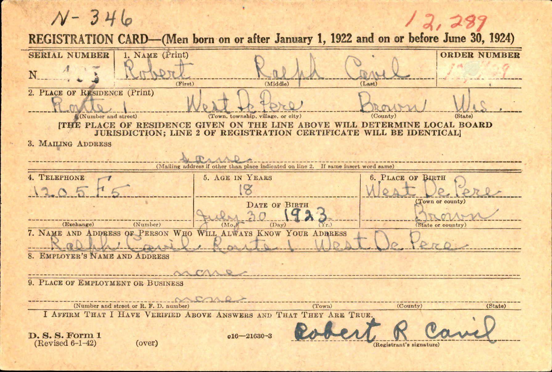 Bob registered for the draft on June 30, 1942 listing his age as 18, no employment, height 5’6”, weight 143 lbs. (1)