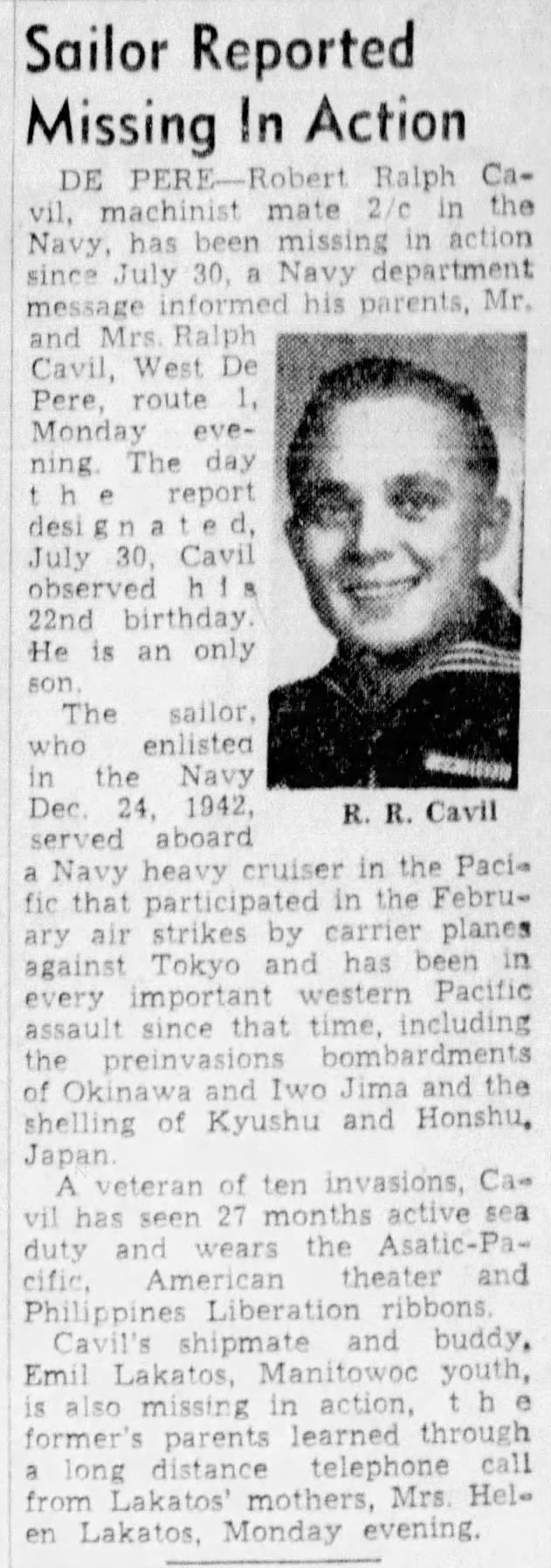 His shipmate and buddy, Emil Joseph Lakatos, Jr., of Manitowoc, WI, lost his life in the tragedy.