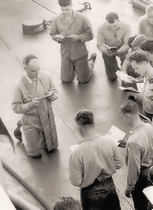 He was often photographed by USS Indianapolis Navy photographer, Alfred J Sedivi. Father Conway was much loved by the ships crew of every denomination. Sedivi’s photos show how crowded some of his services were for Catholic and non-catholic alike. In another photo Father Conway is heading a group of men through the Stations of the Cross, Battle Stations were sounded, Father Tom ended with "God bless you, keep you safe, and give em hell boys." Blessing them all.