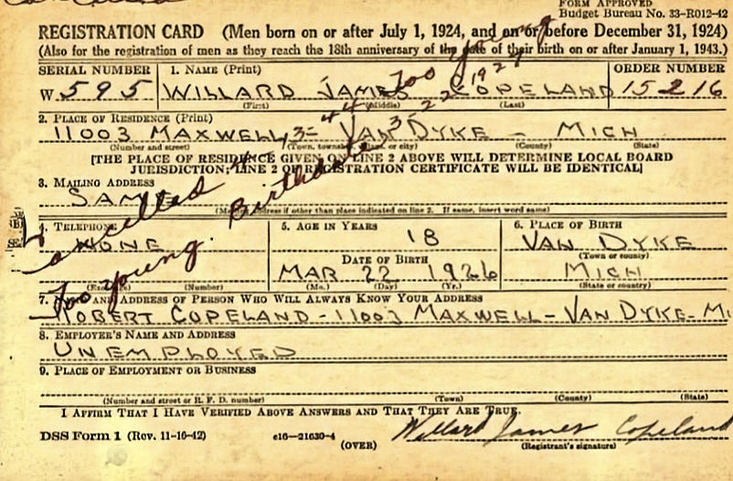 As of May 18, 2025, the website administrator had only received the submission of a copy of the front and back of a Draft Registration Card for Willard James Copeland.