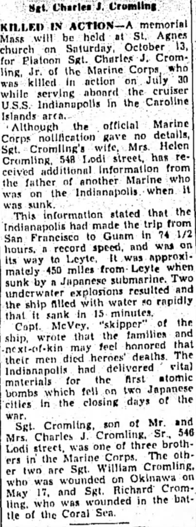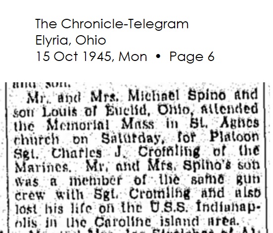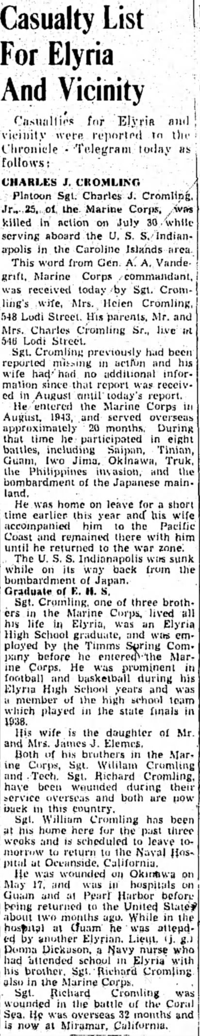 | His name is recorded on the muster roll of the 2nd Recruit Battalion, Training Regiment Recruit Depot, Marine Corps Base, San Diego, CA for the month of Oct, 1943. On the Oct 15th he was promoted to a temporary rank (not stated). This seems to imply that Charles had completed basic training. The following day, he was transferred to Sea School, Headquarters Battalion, Recruit Depot, Marine Corps Base, San Diego, CA. He was received that same day. However, he was granted furlough from October 16-26th, 1943. Sea School was to prepare marines for shipboard service rather than land service in an infantry regiment, for example. Charles would have training which emphasized antiaircraft gunnery skills. In addition to manning guns during battle action aboard a ship, Marines provided ship security at sea and in port, manned the brig on board, provided security for and acted as an orderlies to the captain, as well as any flag commander on board. Also, they conducted ceremonial and honor guard services for the ship. No records were located that show his location during Nov and Dec, 1943. It can only be assumed he continued training at Sea School during this time. The length of training varied during the war, but was normally 8 weeks. Indianapolis was at Mare Island, Vallejo, CA, when Charles reported for duty. Most likely he went aboard at the end of Dec, right before she departed on Jan 1, 1944. His name appears on the January muster roll of the USMC Detachment as a Private First Class (PVT). He would serve on board the ship until July 1945. After a brief stop at Pearl Harbor, Indianapolis steamed to the Marshall Islands. He was about to participate in his first battle engagement and would be Pacific three months before returning to the US. He aided in manning Indy's guns at Kwajalein and Majuro Atolls during the occupation from Jan 29 to Feb 8, 1944. This was followed on Feb 17th through March 2nd in action for the occupation of Eniwetok Atoll. It was on to the western Carolina Islands for the raids on Palau, Yap, Ulithi and Woleai from March 30th to April 1st. On April 10th, Indy departed for Pearl Harbor, then on to San Francisco where she arrived April 21st. It was a quick turnaround and there was not likely enough time for furlough. Indy was back at sea on May 1st and arrived in Pearl Harbor on the 6th. On the 26th, the ship departed and after short stops in the Marshall Islands and training exercises along the way, she reached Majuro Atoll on June 2nd. Admiral Spruance came aboard on the 8th and the following day Indy departed to join TF 58.2 to participate in the capture and occupation of Saipan. Remaining in the Mariana Islands, she was present for the Battle of the Philippine Sea in June and the capture and occupation of Guam and the capture of Tinian in July. There was no rest for the Marine gun crew. In Sept Indy sailed to the Western Carolina Islands for the capture and occupation of southern Palau Islands where she participated in shore bombardments that began on the 11th. Indy sailed back to Pearl Harbor then forward to Mare Island, Vallejo, CA where she arrived Oct 19th for overhaul and repairs. The muster roll shows Charles was granted leave from Oct 18-31. Since the ship did not arrive at Mare Island until the 19th, his leave may have been extended, but this is not recorded in the records. Charles returned home to Elyria, OH, to visit his wife and parents. The local newspaper announced that "his family surprised him" on his birthday on Oct 25th. Indianapolis returned to sea on Jan 3, 1945 bound for the Pacific. The USMC muster roll of Jan 1945 records Charles was promoted to Sgt (Temp Appt) from Corp (Temp Appt) on Jan 11th, two days after Indy arrived at Pearl Harbor. In early Feb, Indy would participate in the 5th Fleet raids against Honshu and the Nansei Shoto in the Ryukyu Islands then forwarding to the Volcano Islands where she would join in the assault and occupation of Iwo Jima. Back to the Ryukyu Islands, the ship participated in the final raids on Honshu and Nansei Shoto then on to the assault and occupation of Okinawa Gunto in March 1945. It was during the operations at Okinawa that Indianapolis was hit by a kamikaze plane on Mar 31st. Nine crewmembers were killed and twenty injured. Charles was not among those injured. He was rewarded for his battle action when he was promoted to Sergeant in April 1945. Charles was promoted to Platoon Sergeant, but the date is unknown. On Wednesday, May 23, 1945, a news article in his hometown paper announced that Charles was home on a 15-day leave and visiting with his wife and parents at Lodi Street. A week later an article announced that relatives and friends gathered "to honor Sgt. and Mrs. Charles J. Cromling, Jr., who left today for the West coast. Sgt. Cromling has been home on leave...... Mrs. Cromling will remain with her husband while he is in this country." Indianapolis was in dry dock for repairs, overhaul and refitting for over two months. It was a common practice for wives to join their husbands during this time. They rented apartments or lived in officer housing provided by the USMC. Wives often remained in the area after Indy departed Mare Island on July 16, 1945. With rumors of the war ending soon, they wanted to be there when their husbands returned. Charles would not return and would never see his son, Charles John, who would be born about eight months later. Charles was one of 39 US Marines serving on board USS Indianapolis CA-35 on July 30, 1945 when she was sunk by two torpedoes from Japanese submarine I-58. Thirty Marines were lost at sea including his hometown friend and fellow gunner Spino, Frank J., PFC. Charles was entitled to wear the Asiatic-Pacific ribbon with one silver star and two bronze star devices representing the seven battle engagements in which he participated. One silver star represented five bronze stars. His name is inscribed on the Tablets of the Missing in the Manila American Cemetery, Fort B