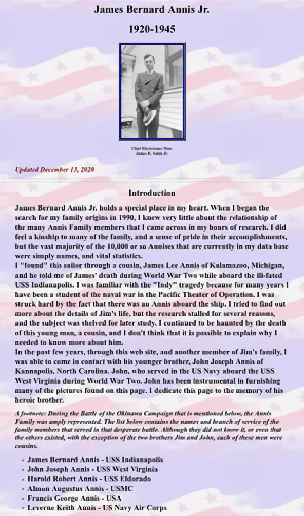 James Bernard Annis, Jr. was born June 20, 1920, in Joplin, Missouri, the eldest son and second child of James Bernard (1888-1968) and Elizabeth Pearl Griffin Annis (1893-1969).