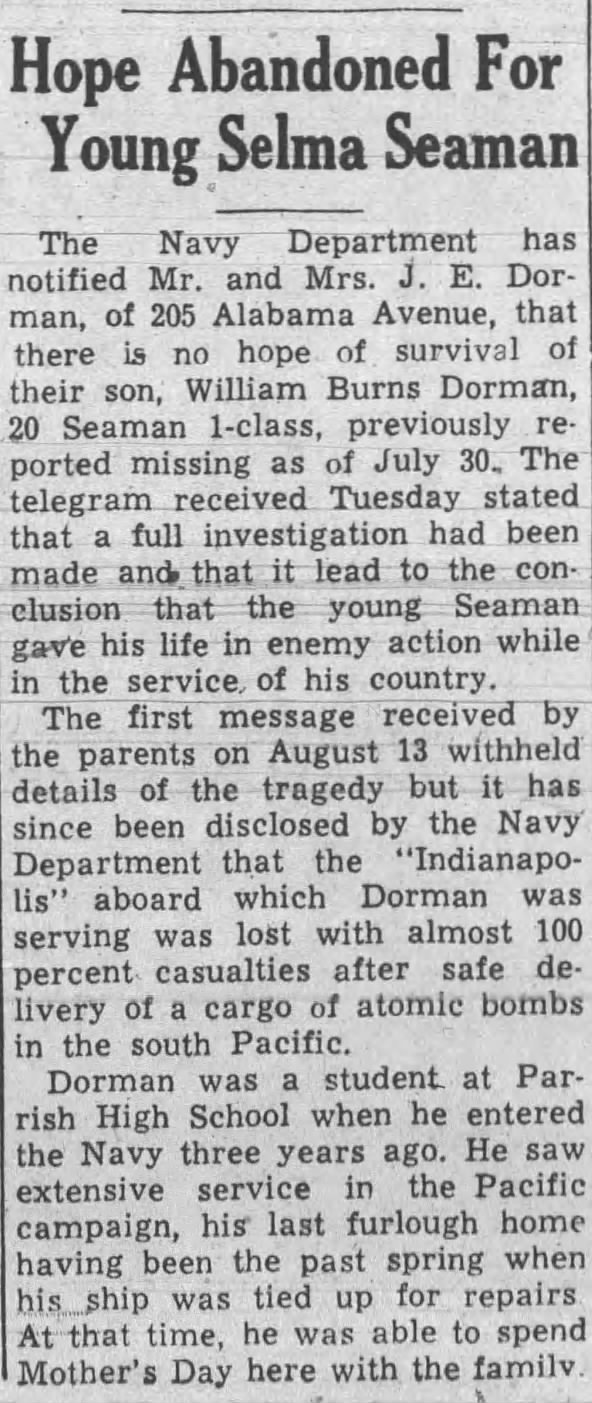 The Selma Times-Journal, (AL), Sun, Jun 17, 1945, p. 30; citing two Selmians on board Indianapolis