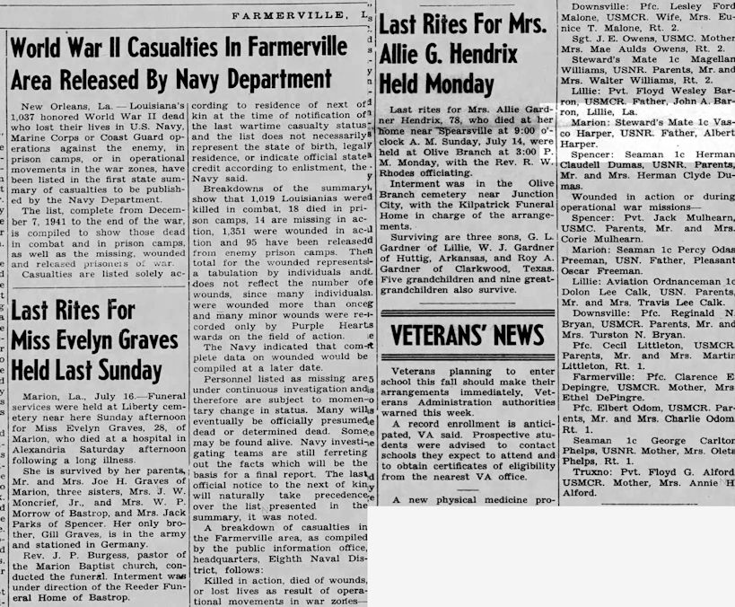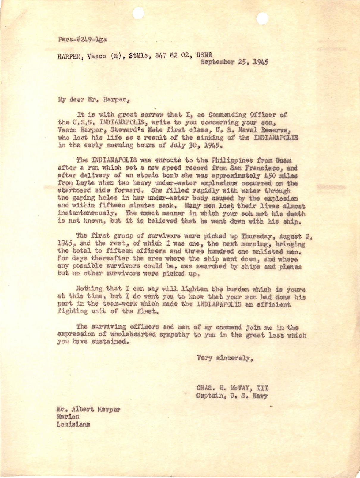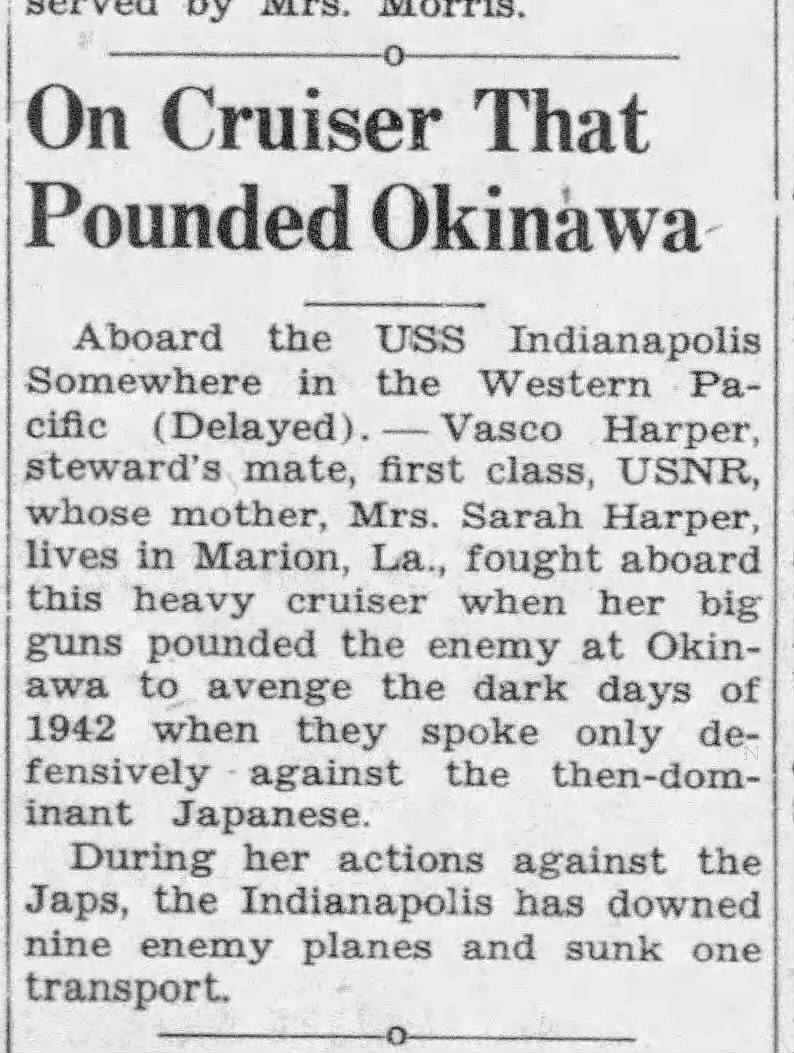 Vasco Harper was remembered in the local newspaper, The Weekly Town Talk, as one of twelve Louisiana residents who perished on USS Indianapolis.