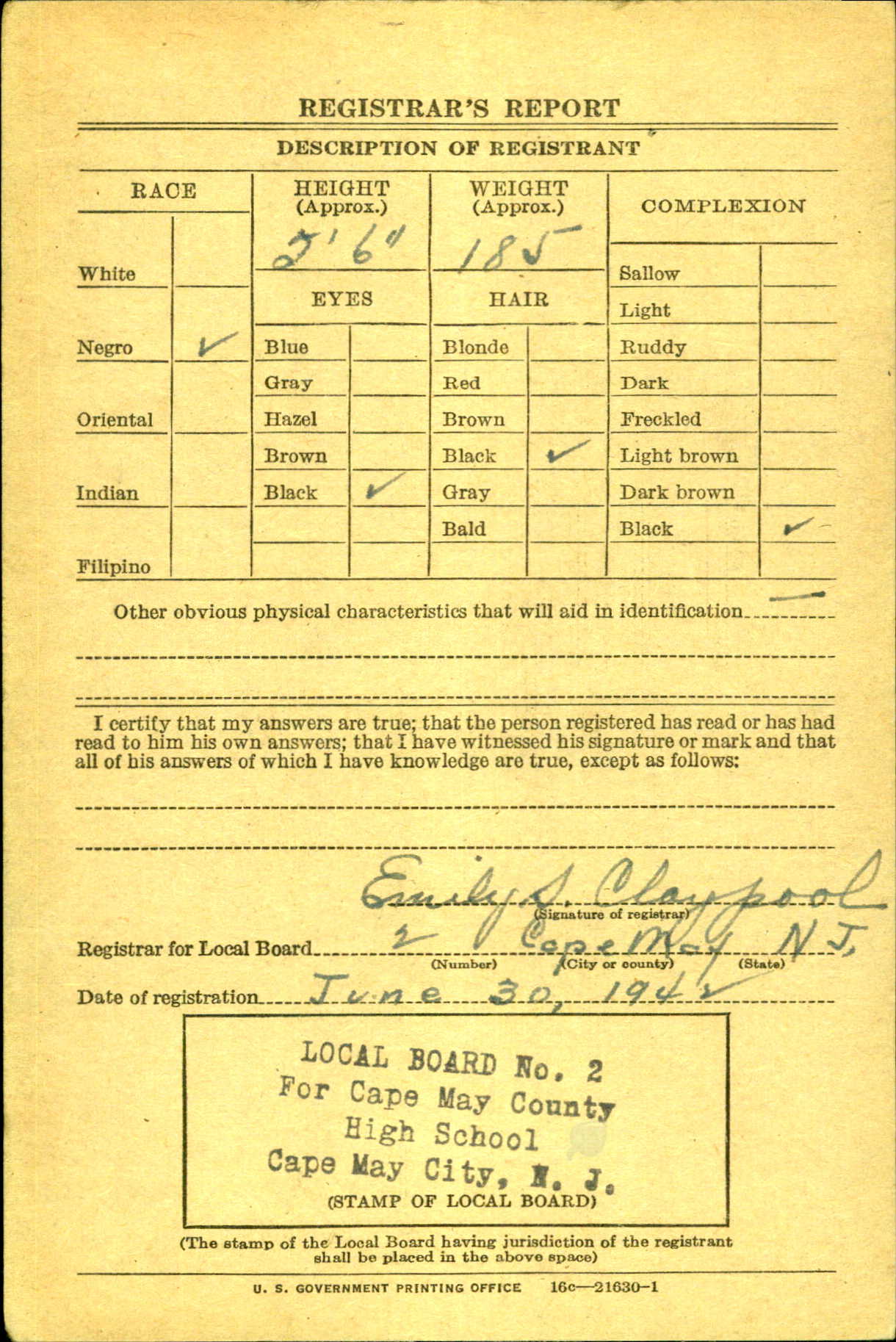 Felix Hayles was born in the rural town of Wadley, Georgia on 7 January 1923. Felix moved to Cape May, New Jersey, and was working at Frank’s Bakery in Wildwood, NJ when he registered for the draft on 30 June 1942.