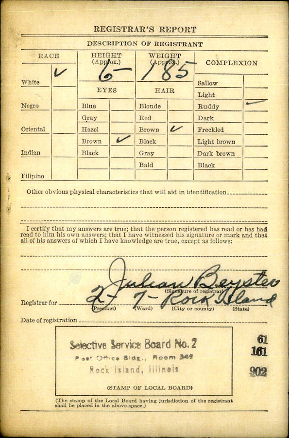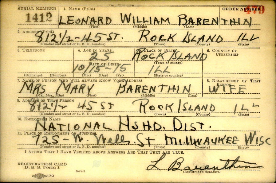 Leonard W. Berenthin, 24 yo, b. Rock Island, IL. Is a high school graduate. He is working for a household products company.