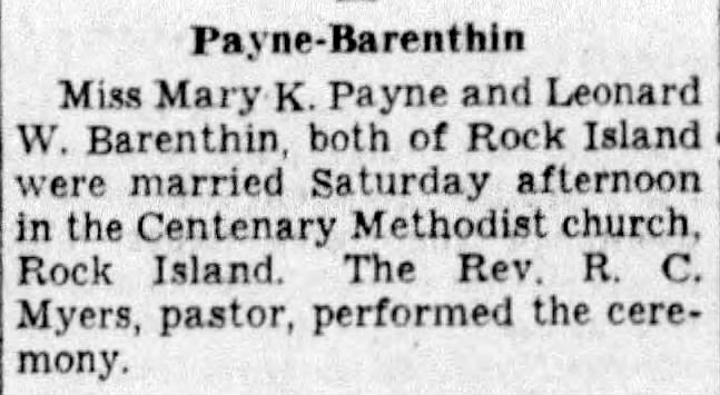 Source CreditsThe Daily Times, (Davenport, Iowa), Mon, May 31, 1937, p. 6; citing marriage of Barenthin and Payne.