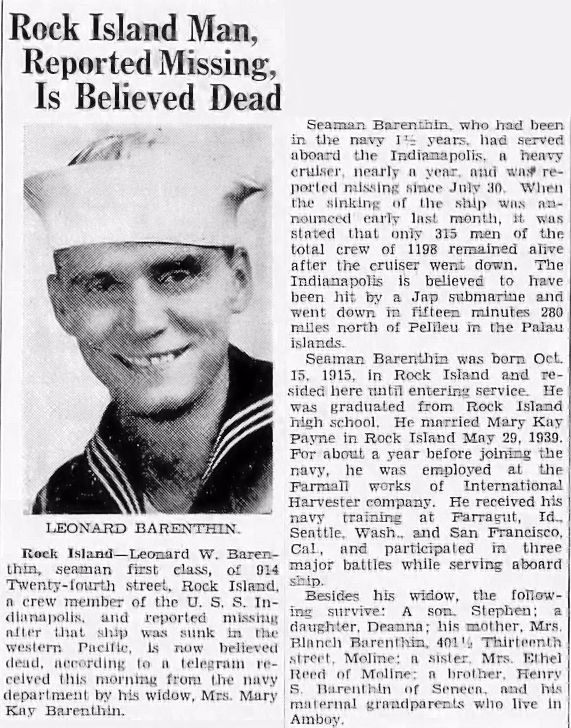 Seaman First Class Leonard William Barenthin was born in Rock Island, Illinois on October 15,1915. He had two siblings: a sister, Mrs. Ethel Reed and a brother, Henry S. Barenthin.