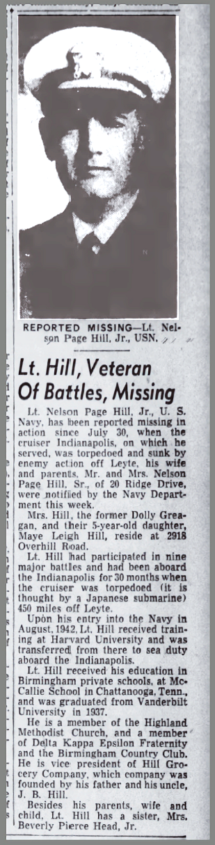 Thursday, August 16, 1945 The Birmingham News, page 7, posted Nelson’s photo wearing his Navy Officer’s Uniform and reported “Lt. Hill, Veteran of Battles, Missing”. His biography followed listing family members, the delivery of the atomic bomb, and the sinking of Indianapolis killing hundreds of men.