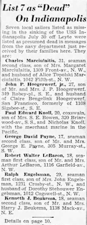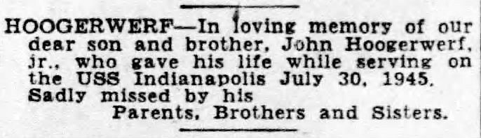 Fireman First Class John Hoogerwerf, Jr. was born in 1918 to parents John P. and Claire (Bengelink) Hoogerwerf, Sr. His parents had ten (10) children.