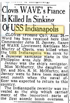 At the time of the ship’s sinking, Jack was engaged and planning to marry Kathleen McMurtry (a Lieutenant WAVE) of Clovis, Fresno County, New Mexico upon Indianapolis' return to the United States.