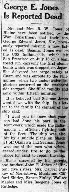 Grainger County News, (Rutledge, TN), Wed, Oct 10, 1945, p. 1; citing George E. Jones is Reported Dead