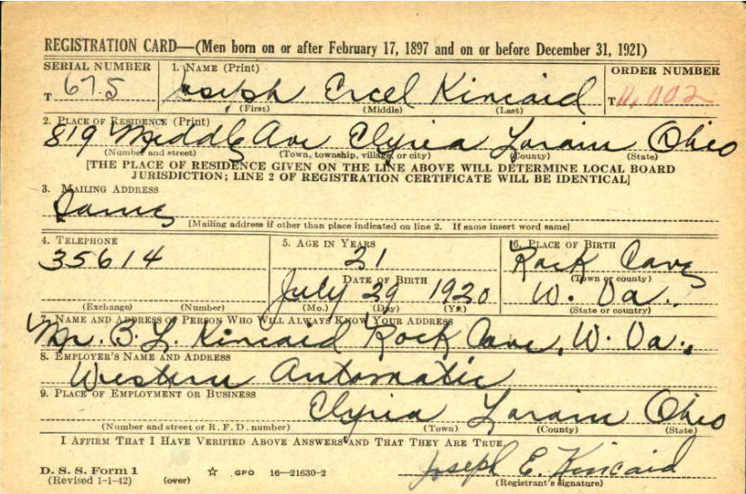 Ercel as he was called registered for the draft on February 16, 1942 listing his father B. L. Kincaid as the person who would always know his address.