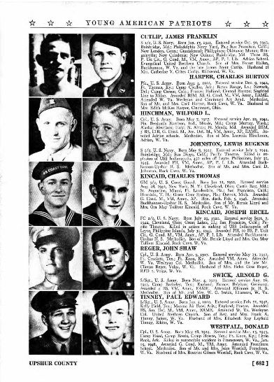 The U. S. World War II Young American Patriots 1941-1944 book features Joseph Ercel Kincaid from Upshur, West Virginia with a photo and description of his navy career. The bio includes a listing of medals and ribbons awarded for the major battles. A copy of Ercel’s bio from a page of this book is included in PHOTOS below.