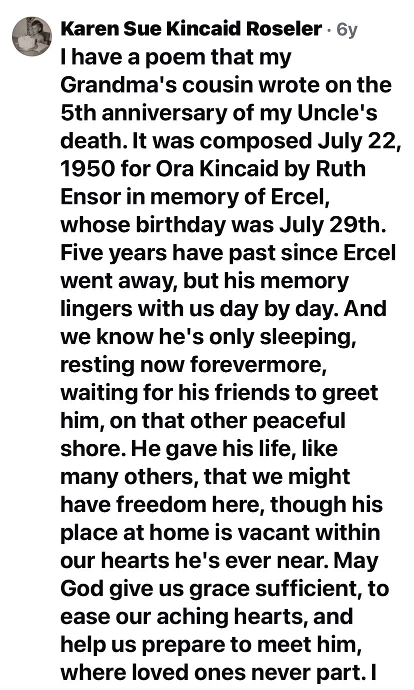 The love for Ercel continues. Karen Sue Kincaid Roseler, daughter of Ercel’s only brother Charles Thomas Kincaid, wrote on Find-A-Grave: