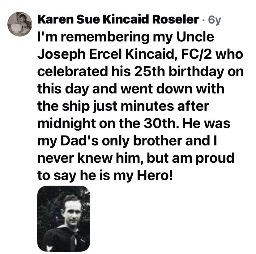 Bernie and Ora May Kincaid would have received two telegrams. The first would inform that Ercel was Missing in Action in the sinking of Indianapolis. The navy asked not to reveal the name of the ship in order not to aid the enemy. The second telegram would end their hope. Ercel would be announced missing with no chance of recovery.