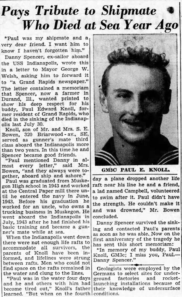Name: Paul Edward KNOLL Rank / Rating: COX-Coxswain Service #: 861 27 59 DOB: Oct 25, 1924 From: Grand Rapids, Michigan Parents: Nicholas Claude Knoll and Inez Bowen Knoll Went Aboard: Sep 08, 1943 Age When Ship Went Down: 20 years, 9 months, 5 days Spouse: Children: Grandchildren: Bio Submitted By: Admin Date Posted: