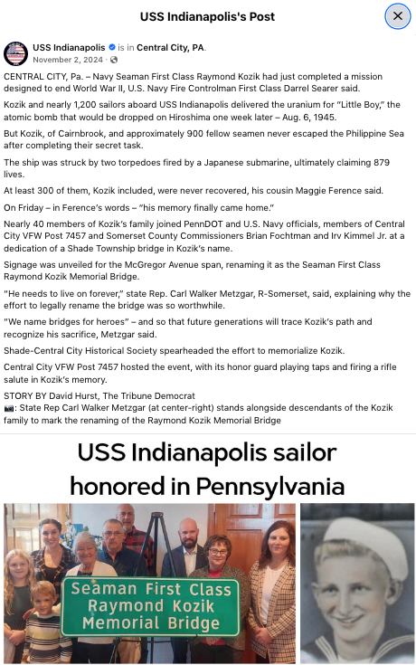 What follows is a November 02, 2024 USS Indianapolis Facebook Account posting which describes the details of the Raymond Kozik Memorial Bridge dedication ceremony: