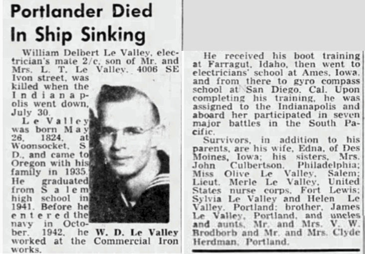Edna was in Des Moines, Iowa just a few days before that fateful day of July 30th visiting her aunt. Bill’s family was totally devastated after the Indy sank. He was only 21 years old.