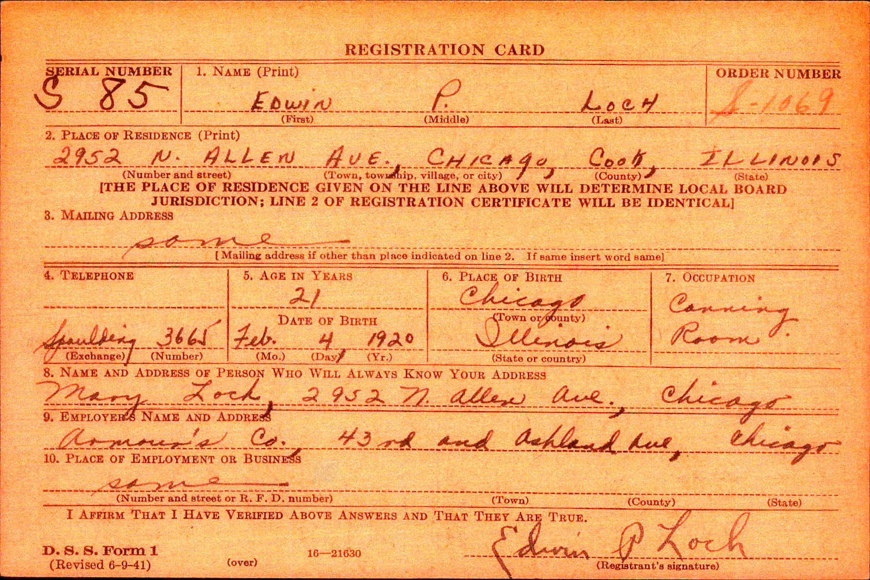 Name: Edwin Peter LOCH Rank / Rating: S1-Seaman First Class Service #: 852 11 71 DOB: Feb 04, 1920 From: Chicago, IL Parents: Went Aboard: Sep 01, 1943 Age When Ship Went Down: 25 years, 5 months, 26 days Spouse: Children: Grandchildren: Bio Submitted By: Admin Date Posted: Jul 30, 2025