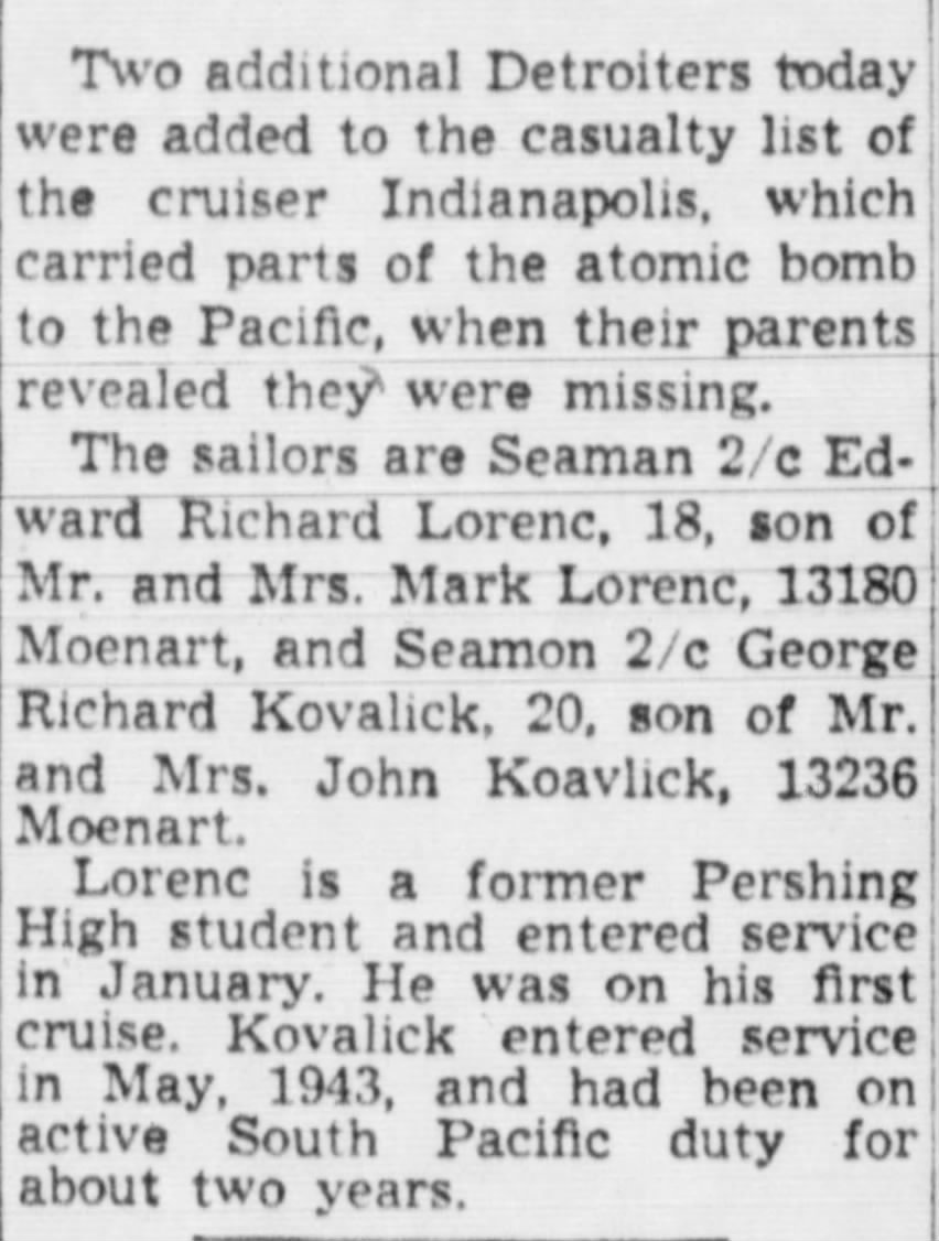 Detroit Evening Times, Wed, Aug 29, 1945, p. 4; citing Edward Richard Lorenc MIA