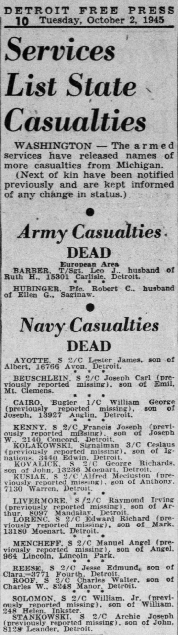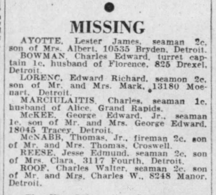 Detroit Free Press, Tues, Sept 11, 1945, p. 5; citing list of Michigan sailors MIA.