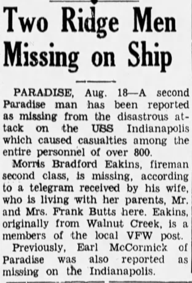 Source CreditsThe Chico Enterprise (CA), Sat., Aug 18, 1945, p. 1; citing Two Ridge Men Missing On Ship