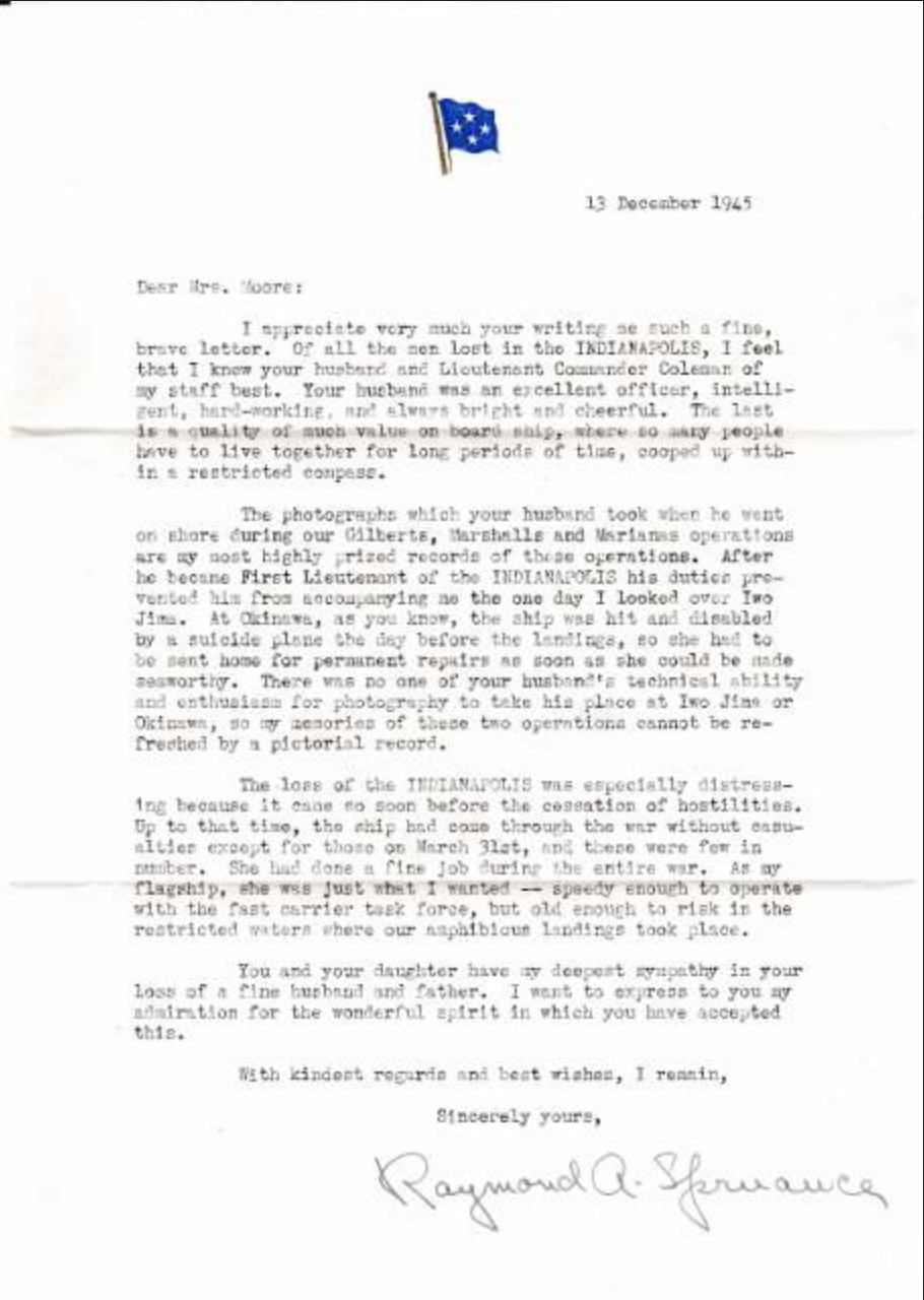 Lieutenant Commander Kyle Campbell Moore was, Lost-at-Sea in the sinking of the USS Indianapolis on July 30, 1945. Mrs. Moore never remarried.