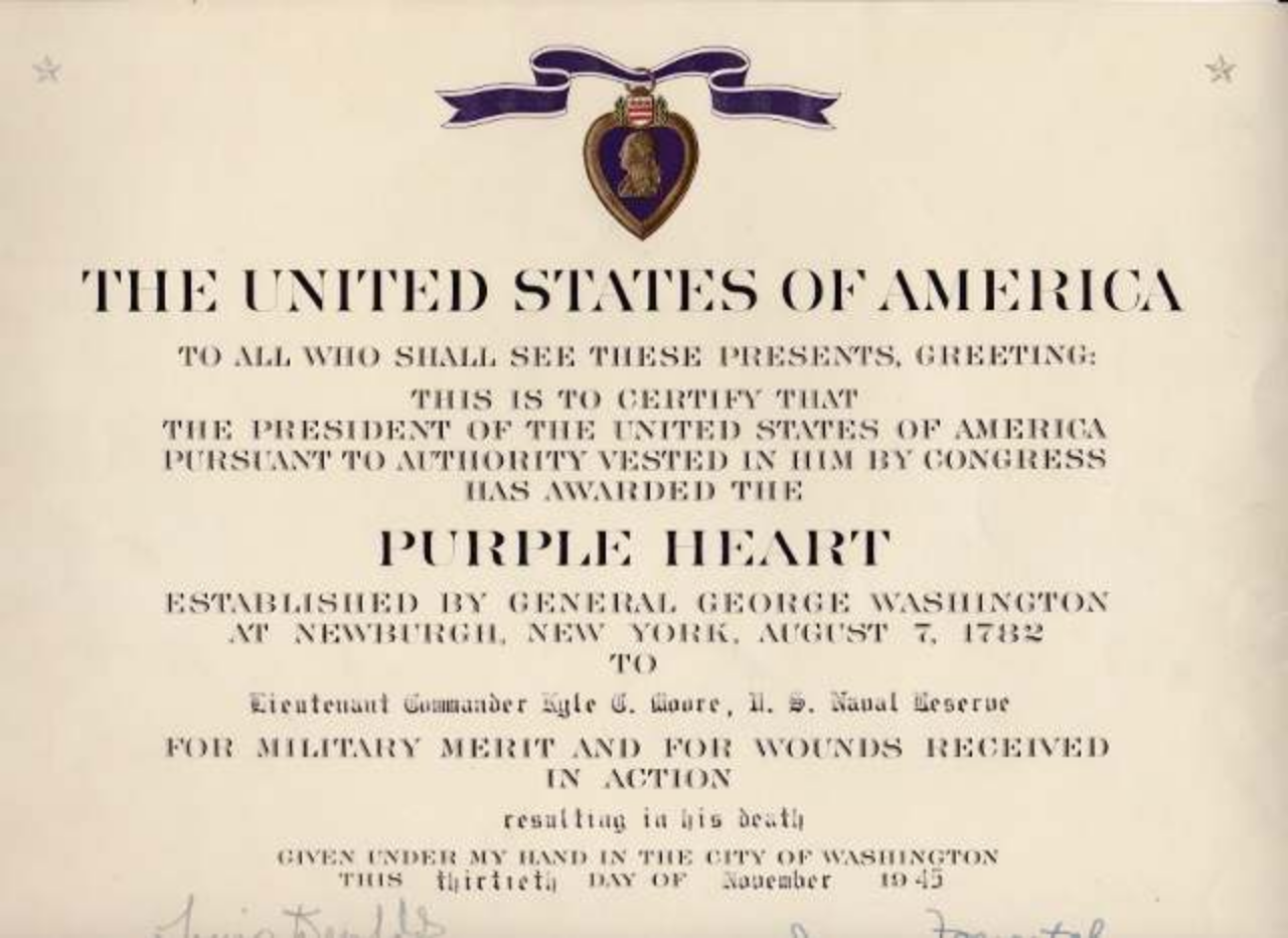 "Kyle Campbell Moore, (1908-1945) Lieutenant Commander USNR. First Lieutenant and Damage Control Officer. Posthumous Silver Star Medal for 'conspicuous gallantry and intrepidity as Damage Control Officer and First Lieutenant of the USS Indianapolis in action against Japanese forces in the vicinity of Palau Island July 30, 1945.' Posthumous Purple Heart, Asiatic-Pacific Medal with nine stars and the Victory Medal.
