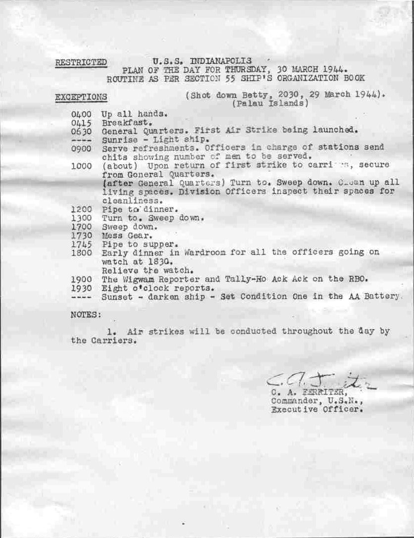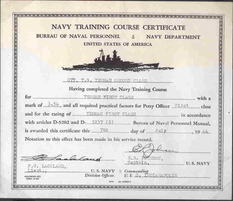 He began his Navy career aboard USS Argonne in March of 1942 as a Seaman 2. He went aboard USS Indianapolis on September 23, 1943, as a Yeoman. He was aboard for the last 8 battle stars that Indianapolis achieved.