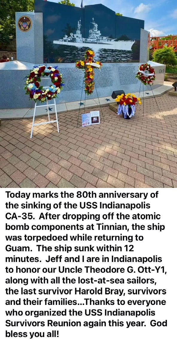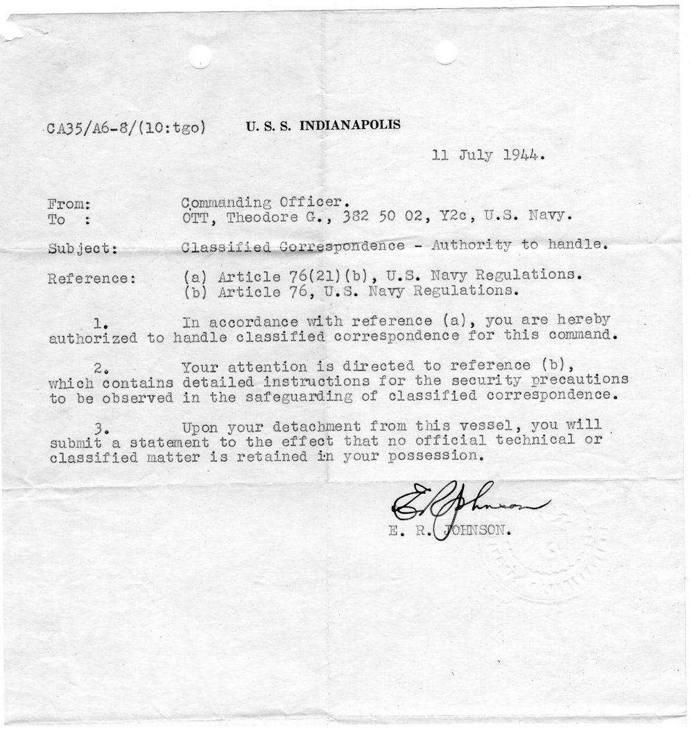 When July came and Captain McVay got his secret orders, Theodore, as a Yeoman 1st class, could tell that something unusual was afoot. He recounted to his family that he was running a lot of messages back and forth from Captain McVay to others in authority. He expressed his unease about the upcoming mission, but he was committed to the oath he had taken and sailed off on July 16, 1945, leaving Peggy behind.