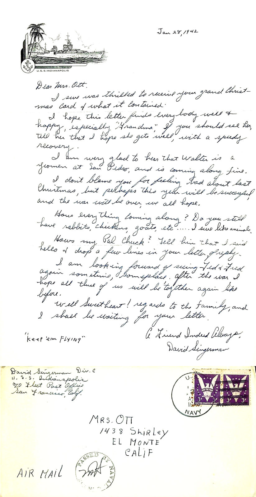Special note see photo below of envelope and letter from David Singerman, also lost at sea when Indy was sunk, to Deanie's mother.