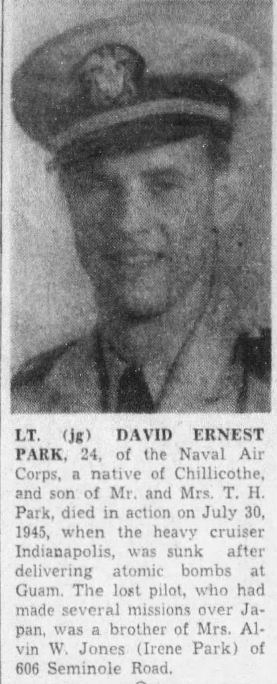Chillicothe Gazette, (Ohio), Wed, Sep 15, 1954, p. 3; citing Chloe McClannahan Park, mother of Ens. David Park