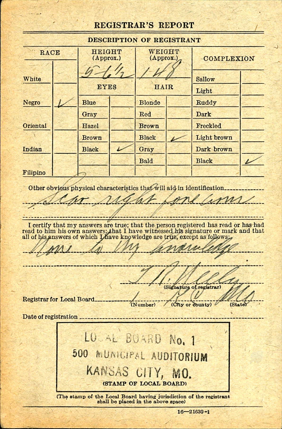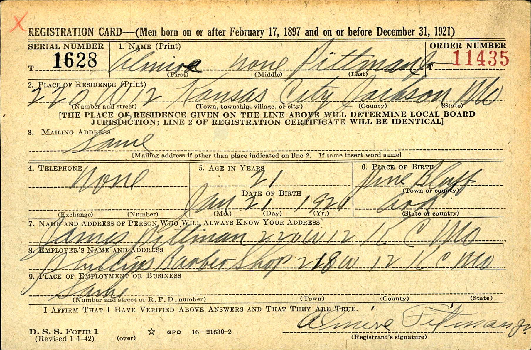 Pittman registered for the draft when he was 21 years old. He was living in Kansas City, Missouri at the time and working at Phillips’ Barber Shop in Kansas City. He listed his brother, James Pittman as the person who would always know his address.