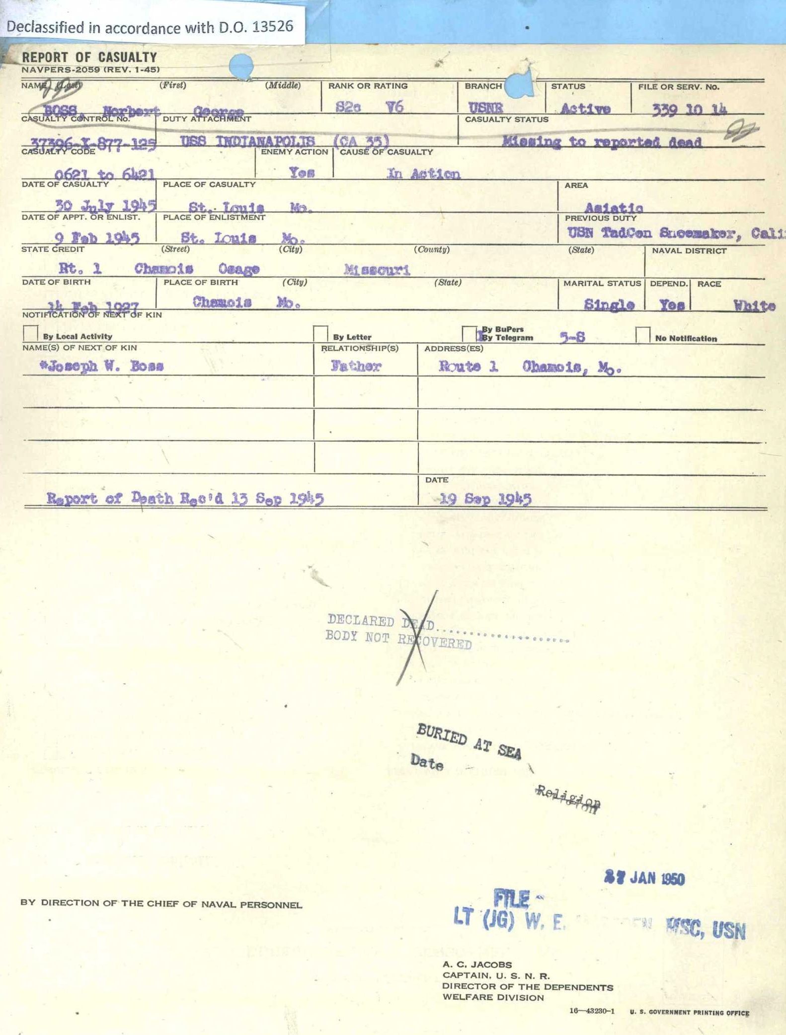 Survivor Gerald M. Poor, S2c, recounted his time in the water after the sinking: "I became good friends of Alfred Jurgensmeyer and Norbert Boss. I remember Jurgensmeyer became disoriented , and I was holding him in my arms when he died. There were officers and corpsmen who would come and help 'bury' someone when they passed away. Finally, there were only corpsmen left. When I called for help to 'bury' Alfred, I was told there were no more corpsmen left and I would have to do it myself. Norbert helped me and all we could do was take off his life jacket, say a prayer, and let him slip into the water. Later, Norbert became disoriented and kept asking about Alfred." Norbert swam away and "I never saw him again."