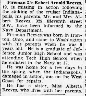 Navy Department, Casualty Section, Office of Public Information (1946): Combat Connected Naval Casualties, WWII, by States; Vol. AL-MO; DC, p. 5; citing Robert Arnold Reeves, F2c, s/o Mr & Mrs Albert Reeves, 329 11th St. S.W.