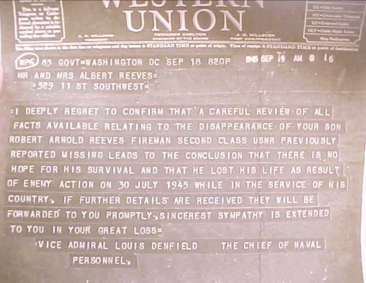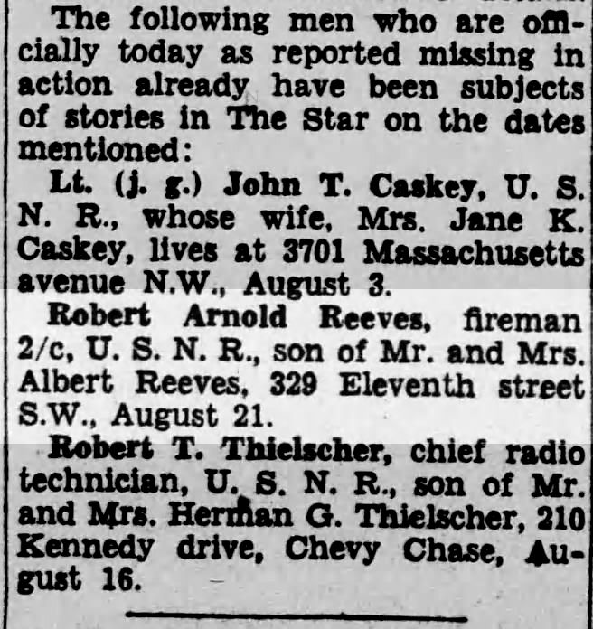 The Evening Star, (Washington, DC), Tue, Aug 21, 1945, p. 2; citing Albert Reeves, MIA