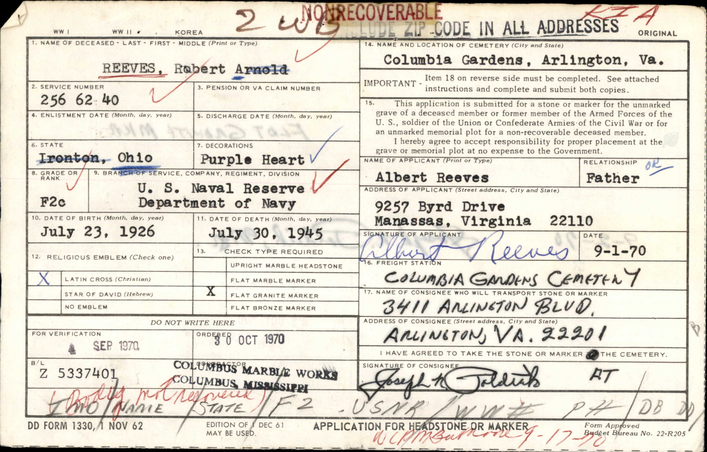 US Government, Department of Veterans Affairs, Application for Memorial Grave Marker; citing headstone application submitted by Albert Reeves, Sept 1, 1970. Flat Granite Marker. Columbia Gardens Cemetery, Arlington, VA.