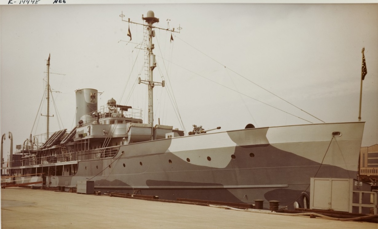 His new home was originally a luxury personal yacht named Delphine and acquired by the USN in Jan 1942. She was gutted and reconfigured to accommodate more crewmen as well as refitted as a gunboat. Her once white exterior was painted with a camouflage pattern. A photo of the ship, below, was taken c1944-1945. She was armed with 2 3"/50 dual purpose gun mounts. Her length was 257' with a beam of 35' and she carried a complement of 135 men that included a Marine detachment.