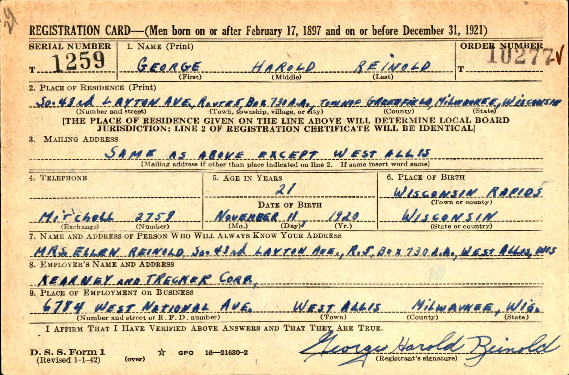 George registered for the draft on Feb 14, 1942, in Milwaukee. He was 21 years old and living in Greenfield, Milwaukee, WI.