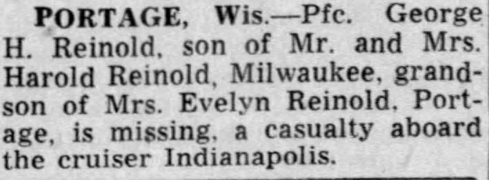 USN Casualty book, (MT-WY), WI, p. 18; citing mother Ellen D. Reinold, Milwaukee