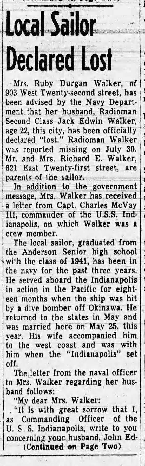 Radioman 2nd Class Jack Edwin Walker was born June 14, 1923, in Anderson, Indiana.